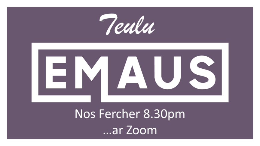 Teulu Emaus – 28.4.21 llyr25/04/2021Newyddion Dechre am 8.30 ar Zoom – Cyfle i drafod ac ystyried beth sydd gan Dduw ar ein cyfer fel teulu Emaus. Côd Zoom i’w gael yn grŵp WhatsApp Teulu Emaus. Cysylltwch os hoffech cael eich ychwanegu at y grŵp!